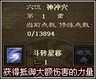 | 奇经第一个穴位“神冲穴”对应的第一个技能“斗转星移”,它是被动技能,无需设置快捷键!它可抵御大额伤害,利用内力吸收、分担所受的伤害,然后催动内功进行恢复,减少自身生命值的损失! |
